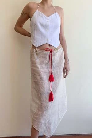 Material: 100% handwoven cotton with voile lining, silk rouleau straps and brass amulets.