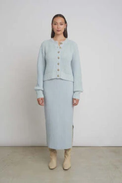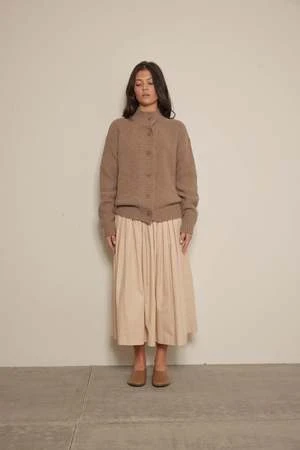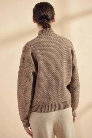 This 100% wool knit cardigan features a high neck, statement knit, and ribbing at the waist, cuff, and neck. In a warm shade of brown, it styles perfectly with denim and dresses, from day to night.