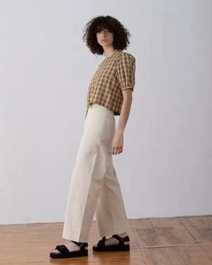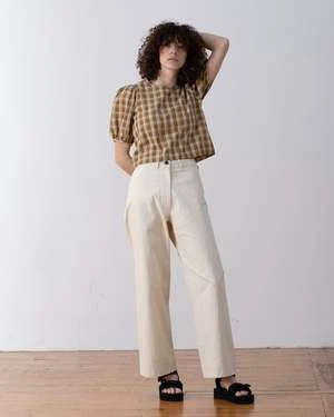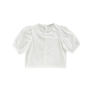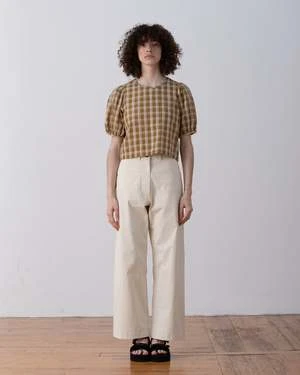 Simple top with puff sleeves. Keyhole button closure at center back. This top is running a bit small 🙂