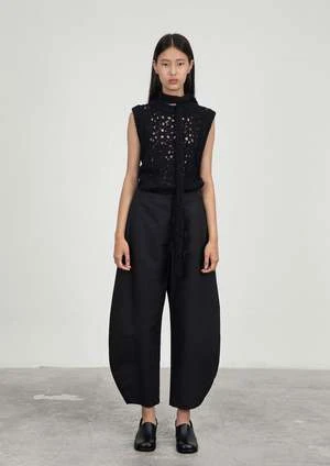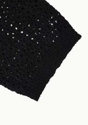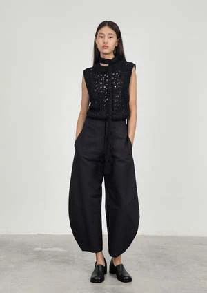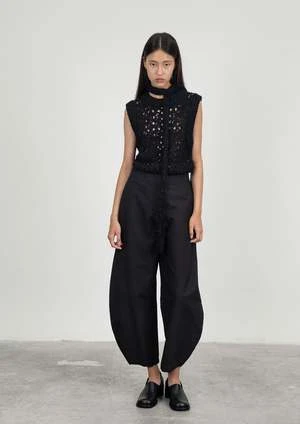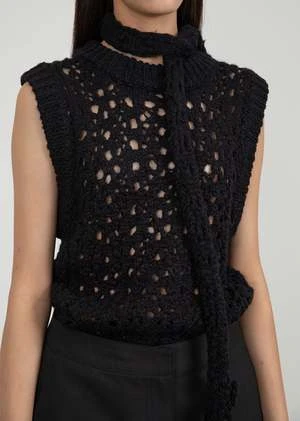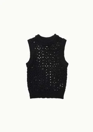 The Crochet Vest by Amomento is made from a loose crochet alpaca wool-blend material. Wear it on it’s own or with a t-shirt or layered over a button-up or turtleneck. Features an irregular pattern which creates a unique texture and ribbed finishing at neck, sleeves, and hem.