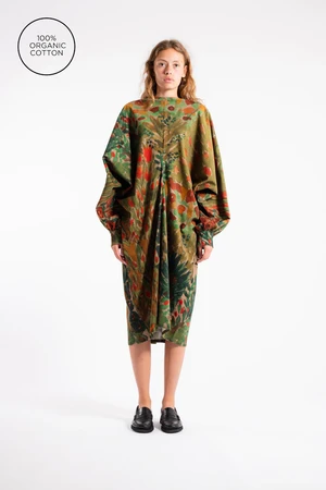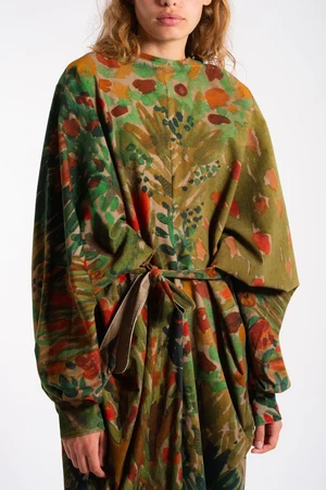 Mid-length, fine corduroy dress with voluminous sleeves. Comes with a detachable belt and dark marble print.