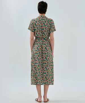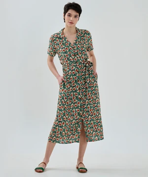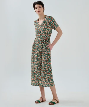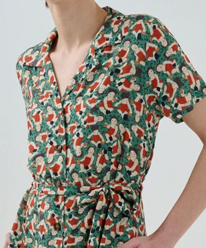 Crafted from high-quality materials, this dress is designed with a relaxed fit that drapes beautifully on the body. The shirt dress style is both classic and modern, making it perfect for a variety of occasions. The dress also features a button-up front and collar, adding a touch of sophistication to the playful print.