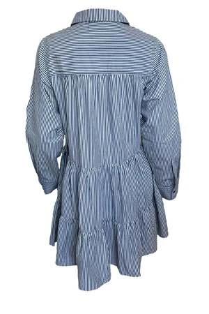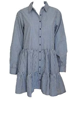 This dress from Apiece Apart features a shirt collar, dropped shoulder, front button placket, and two tiered skirt.