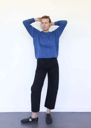 – then finished for a relaxed structured look. Designed to sit at the natural waist with a pieced outseam, kinked leg shape and frayed hem.