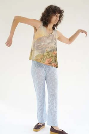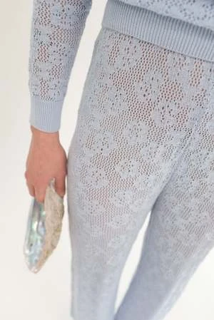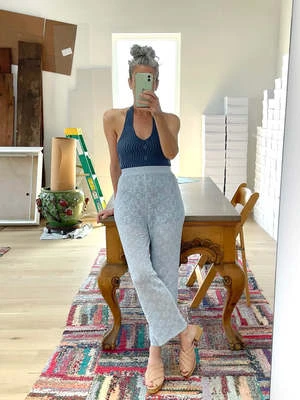 Hand knitted floral lace pant. Straight leg with a gentle elastic waist. Ultra comfortable, super soft, dreamy pant. 100% Cotton. Runs true to size, with a natural gentle built in stretch. We are nuts over these!