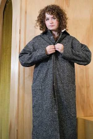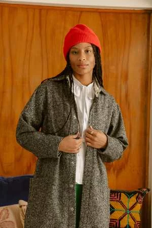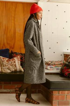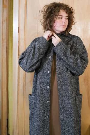 The newest version of Carleen’s Harris Duster with the classic slightly oversized fit, made from a wonderful deadstock salt and pepper wool. The Harris Duster features snap closures and deep patch pockets to hold all your things. This jacket is built to last and will elevate your outfits through the seasons to come.