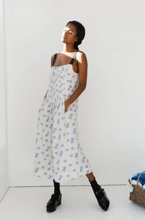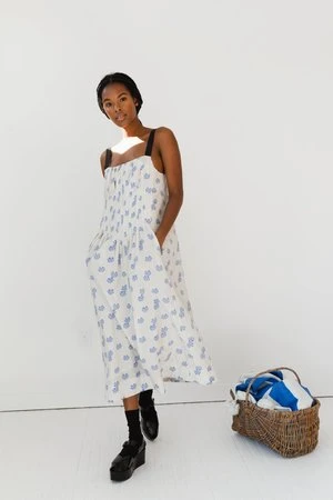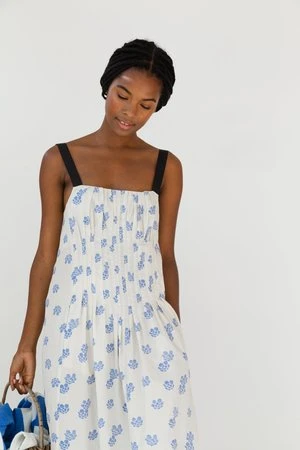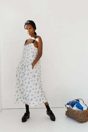 – Mid-length dress with dense pleats at the front of the bodice that gives volume to the skirt and pleated gathers to the neckline.