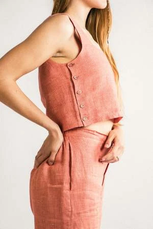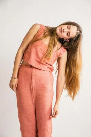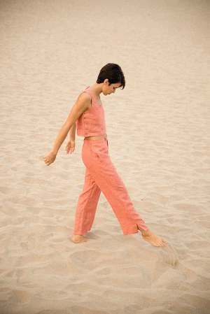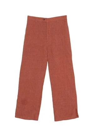 The Doris pants is a loose fit with elastic strap inner detail on backside for confortable. It is tied with resin natural buttons and nickel free zipper.