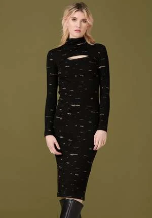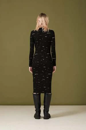 Long fitted dress that remains very comfortable thanks to its stretchy fabric. Perfect for this winter with its long sleeves and turtleneck. We like the pretty opening detail at the front which adds that little something extra.
