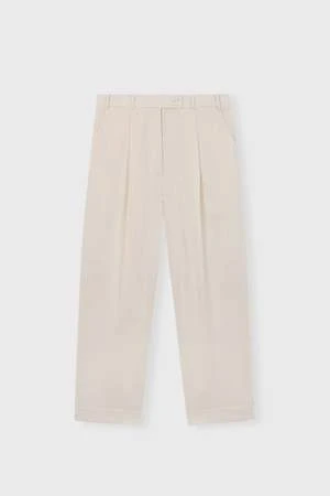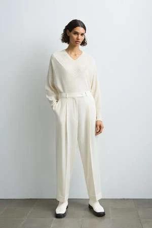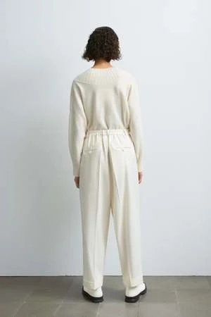 Timeless modernity trousers, designed to use them all year round. Made from high quality fabric with a loose fit masculine shape. They have an elasticated waistband on the back, zip and button closure, finished with front and back welt pockets. Perfect to wear with a shirt, is the uniform everybody needs in their closet.