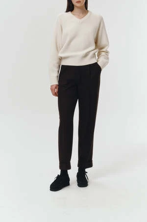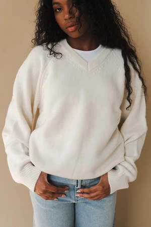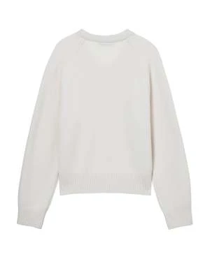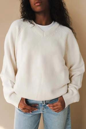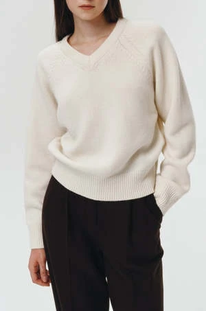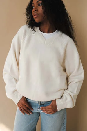 Dunst unisex merino wool v-neck sweater in cream. Knitted from soft touch wool-blend, it’s minimally designed with narrow ribbed V-neck and classy raglan sleeves.