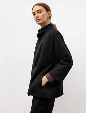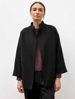 Another beautifully understated jacket from Dusan. Constructed from a heavyweight cashmere blended fabric, it is the perfect item to layer with as you don’t have to fuss with a closure. It has a regular fit with no shoulder seam allowing for ease with sizing and styling. Other details include two side pockets and a little stand collar.