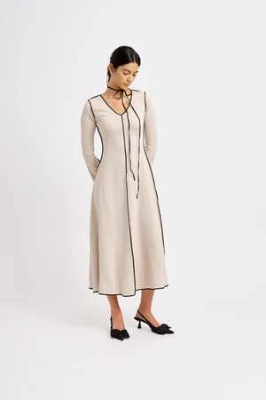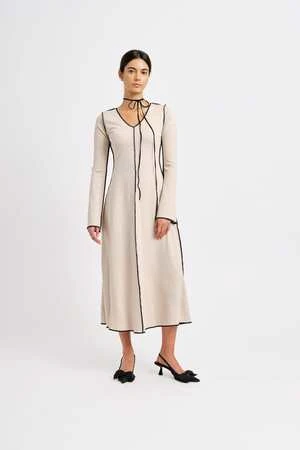 Crafted from thick ponte fabric, the Clara dress in cream features bold black topstitching. With its classic A-line silhouette and subtly bell-shaped sleeves, this dress is effortless and easy to wear.
