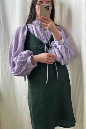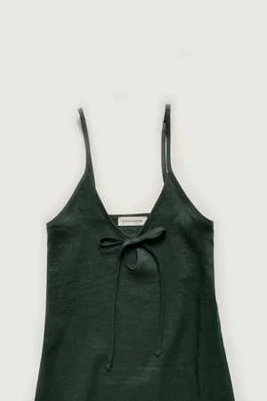 For our take on the 90’s classic slip dress – we bring you the Drew dress. The Drew is a classic slip dress shape, only a little more a-line through the hip. This dark green linen slip has a deep V-neck and peep hole at front, all topped off with our classic spaghetti bow and we made the straps adjustable for an even better fit!