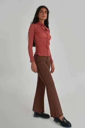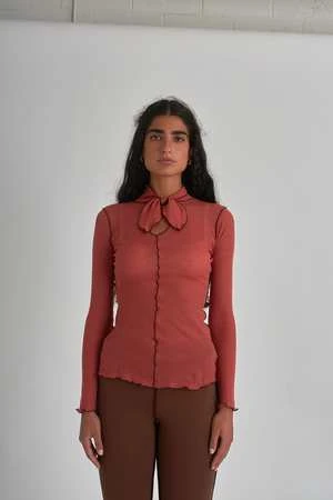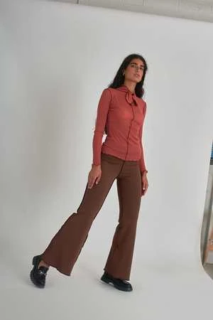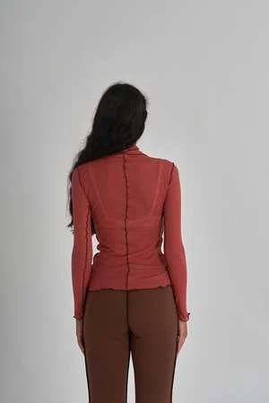 The Pippa top in burnt orange is made from a luxuriously soft and lightweight wool / Tencel blend. It’s warm but super light to wear, and great for winter layering. The top has exposed dark brown stitching and a peephole at the neck so it’s easy to slip on over your head.