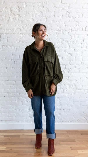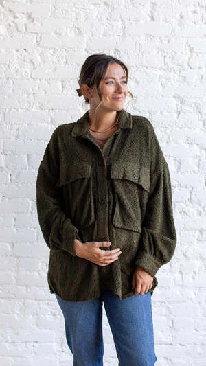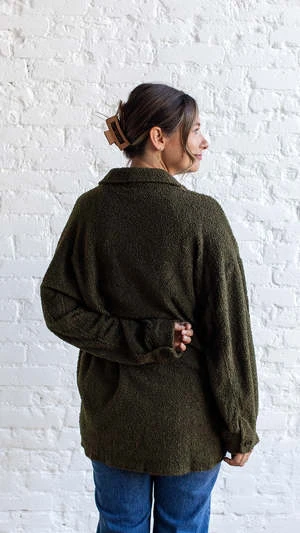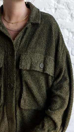 Looking for the perfect item to tie together your outfit? Let all your layers come together effortlessly with the Ozzy shacket. This olive green sherpa button-down is perfect for those chillier days. Stay warm and stylish with this playful piece!