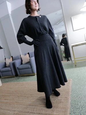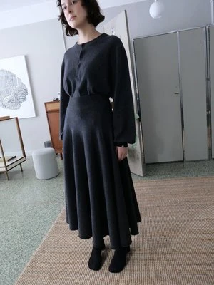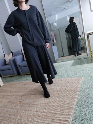 EXTREME CASHMERE N280 BI SWEATER IN SHADOW. A CASHMERE BLOUSE SWEATER WITH VOLUMINOUS BALLOON SLEEVES AND FRONT BUTTONS DOWN THE MIDDLE. FEATURES ROLLED HEM AND RIBBING AT NECK AND SLEEVE. MACHINE WASHABLE. ONE SIZE. SUITABLE FOR EXTRA SMALL TO LARGE BODIES. CHEST MEASURES 25 INCHES, HEM WIDTH MEASURES 24 INCHES, AND TOTAL LENGTH IS 26 INCHES.