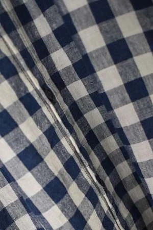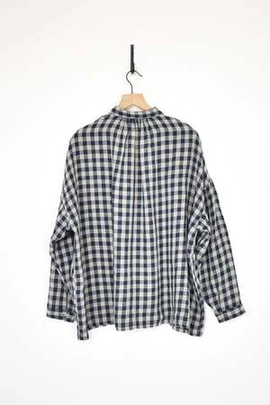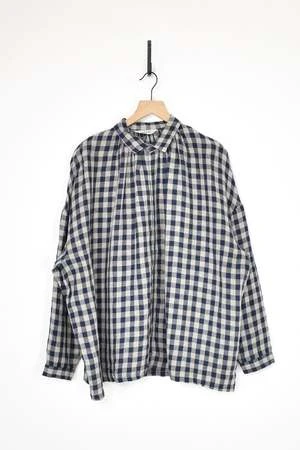Azumadaki Linen Gingham Shirt in Beige designed by Ichi Antiquites. Fold over collar with button front closure. Slightly gathered at yoke. The Japanese Azumadaki washing method creates a soft, crinkled texture.
