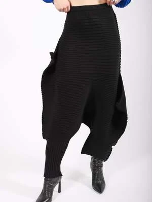 The Rectilinear Pants in Black by Issey Miyake are crafted from lightweight seamless knit that combine two-toned rectangular shapes into a sculptural silhouette. Featuring an elastic waistband, one right side pocket, and a tapered leg.