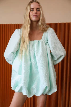 A big dramatic dress that feels like wearing nothing, sewn in our abstract floral Seafoam Brocade. Balloon hem with under-dress that follows the body so you feel held, while the outer-dress poofs and swings. Gathered pleats along the enclosed elastic neckline makes for easy on / off, full bishop sleeves finished with bias bound cuffs. Pockets of course. Snaps at shoulder to hold bra straps.