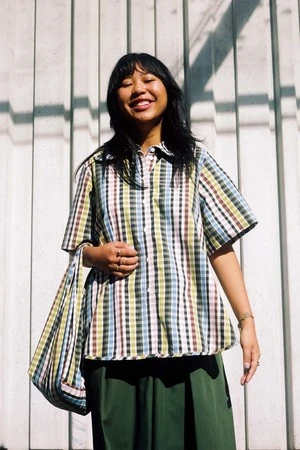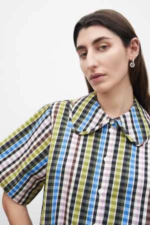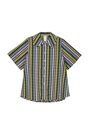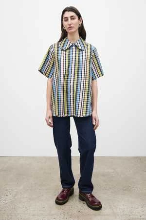 A short sleeve shirt in our statement Autumn Check with a flared fit through the body and featuring a curved, oversized collar. Made from a crisp organic cotton poplin.
