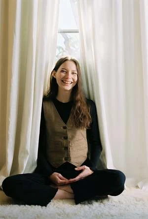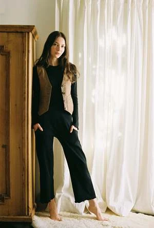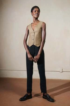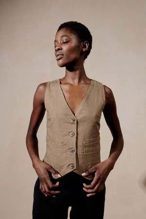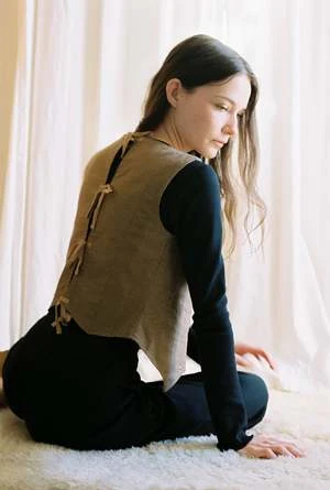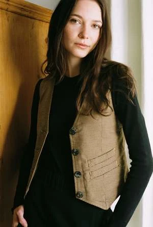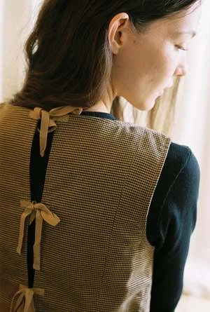 A fully lined vest inspired by tailored menswear, with a v-neckline and front welt pockets. Cotton twill tape ties up the back. The micro-houndstooth pattern is tan/dark brown in color.