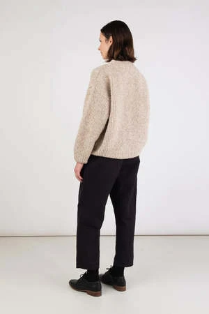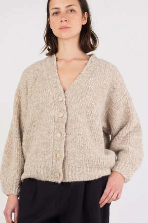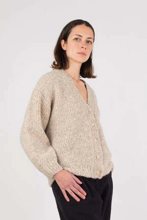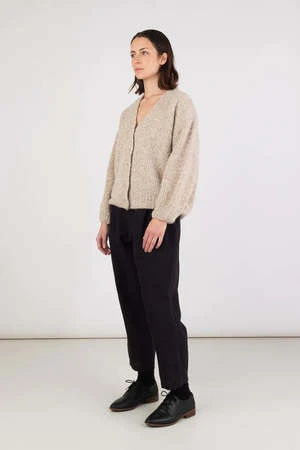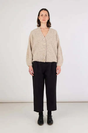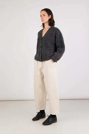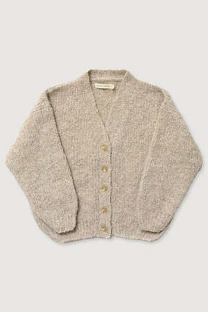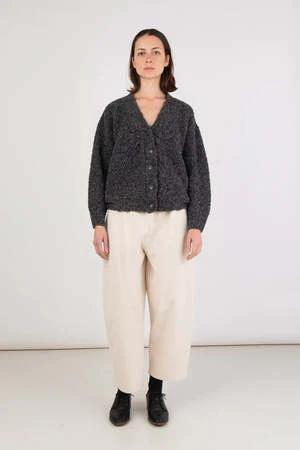 The Twist Cardigan is a textured button up sweater knit from an Alpaca Boucle, sporting a subtle rib and ultra-soft hand feel. A v-neckline meets at the front button placket, and shaped sleeves top off a relaxed, slightly oversized silhouette. Twist can be worn buttoned as a top or unbuttoned as a top layer as a perfect, versatile capsule piece. Available in Oatmeal and Charcoal, the Twist Cardigan is an easy to style wam weather essential.