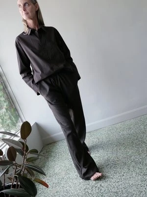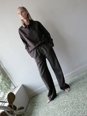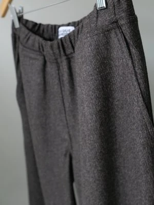MONIQUE VAN HEIST PJ FLEX PANT IN BROWN MELEE WOOL. STRAIGHT CUT ELASTIC WAIST PANTS IN A FINE MERINO WOOL. FEATURES SLIP POCKETS AND EXAGGERATED LONG PANT LEGS. MEASURES APPROXIMATELY 46 INCHES LONG IN THE LEG.