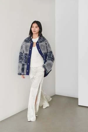 Oversized fleece liner jacket from Nomia with silvertone snap closure. Patchwork bandana print fleece jacquard fabric with two patch pockets at the waist in contrasting faille fabric. Underarm slits for ventilation, with navy nylon faille binding, and a curved hemline. Fully lined.