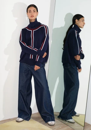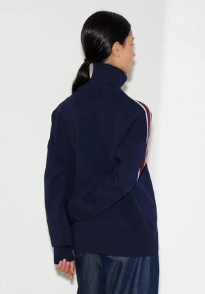 Loose fitting mockneck sweater in dark midnight with bordeaux and periwinkle stripe down center front and sleeves. Ribbed collar, cuffs and hem. Dropped Shoulder.