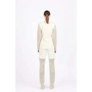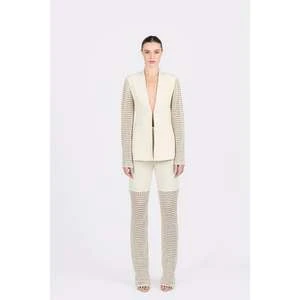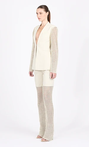 The Lauren Blazer is one of a kind. Combining the elements of classiness and contemporary, this blazer features hand crochet sleeves. The body of the blazer is made from a soft, luxurious fabric. It is hooked in the middle to create a deep-cut neckline and is open at the bottom. Pair with the matching Rowan Pant.