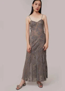 Flowy, semi-sheer ankle-length sheer dress with a delicate flower jacquard and silky godet hem. Features adjustable shoulder straps and concealed zip fastening at side.