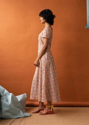 Bias cut dress in a Liberty Tana Lawn cotton. Features short sleeves and a wide scoop neckline. The bodice is shaped with front darts, leading into a fitted waist and a long bias skirt and carefully finished internally with french and bound seams. The dress fastens at the side with an invisible zip.