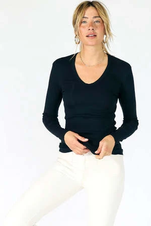 we’ve upped our game for fall and added this sexy, slinky, cotton rib that works for every body type. made from 90 cotton/10… an ultra deep u-neck and only in the most elevated colors, black and sugar, perfect for date night.