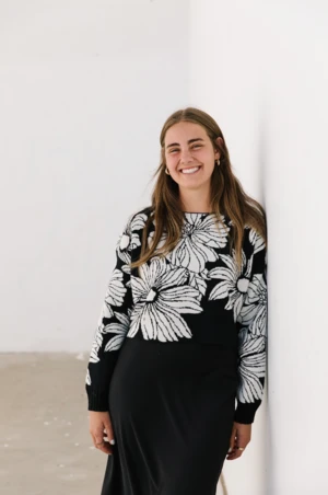 Create a beautiful black and white outfit with this sweet sweater! The Jupiter Sweater is an easy silhouette to wear with a beautiful floral pattern in a black and white print. It is slightly cropped with full length sleeves and a dense but lightweight knit that is the perfect breathability for fall and winter.
