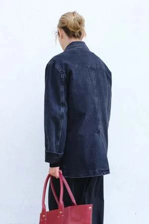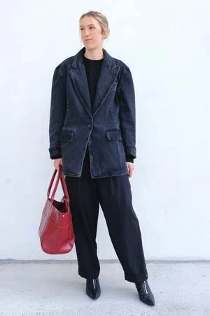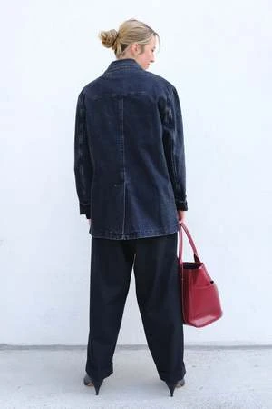 An oversized blazer with a rounded shoulder and elongated notched lapel in a Washed Salinas Denim. This jacket is fully lined and features a welt pocket at chest and flap pockets at the waist.