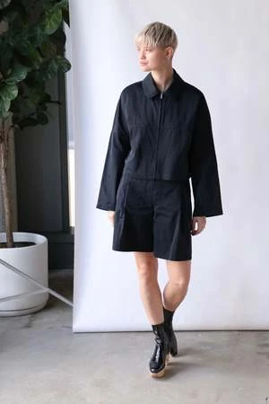Cropped zip-up blouson jacket with a drop shoulder and rounded sleeve, in our classic washed black Salinas Denim.