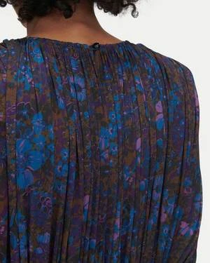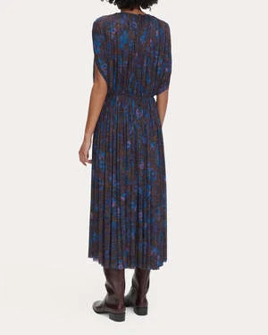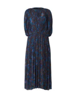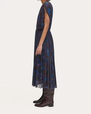 The Daphne Dress in Blue by Rachel Comey is a sleeveless, midi dress featuring a 70’s inspired floral, keyhole back, and waisted detail crafted in a floral print mesh.
