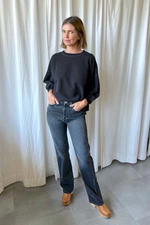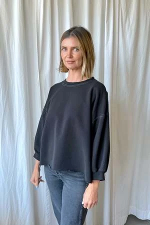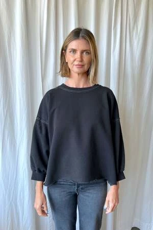 Crewneck sweatshirt with drop shoulders, cropped sleeves, raw edge hemline, and unique distressing throughout.