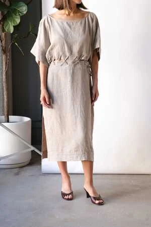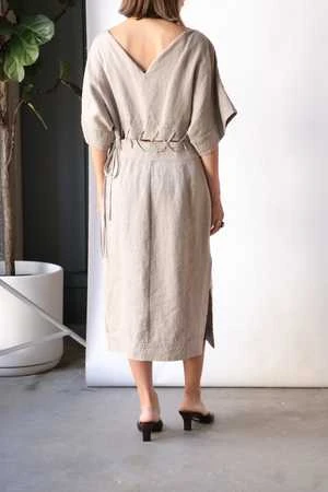 Boatneck dolman-sleeve dress with a pencil skirt in Heavy Linen, featuring peekaboo lacing at the waist. This style sits off the body at the top and is a touch more fitted through the hip, with a side slit for ease of movement.