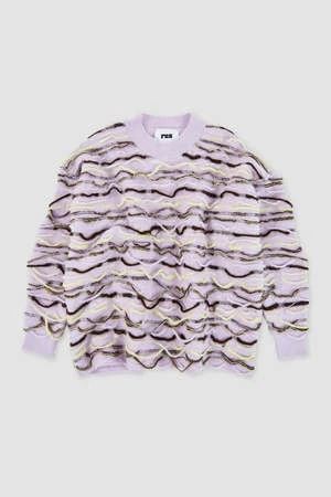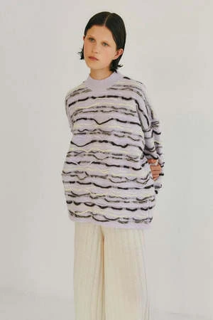 Cozy, multicolored sweater made from soft, fuzzy baby alpaca blend. Features unique frayed details and a striking reversed weaving motif, loose threads adding texture. Boxy silhouette has ribbed details – crewneck, cuffs and hem – for a timeless look.