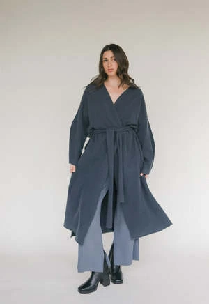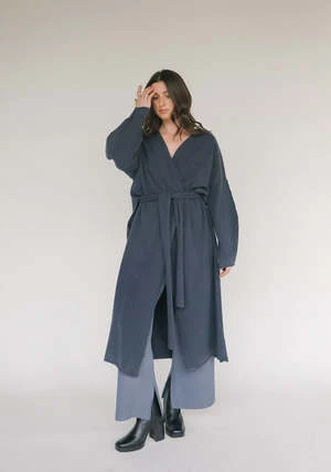Relaxed belted coat knitted from a soft and lightweight wool-cashmere with a felted effect. Features voluminous sleeves, exposed seams and deep side splits. It can be cinched at the waist using the matching rounded belt.