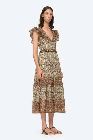 The Marlee border print dress features a v-neckline, smocked bodice, ruffle detailing and flutter sleeves.