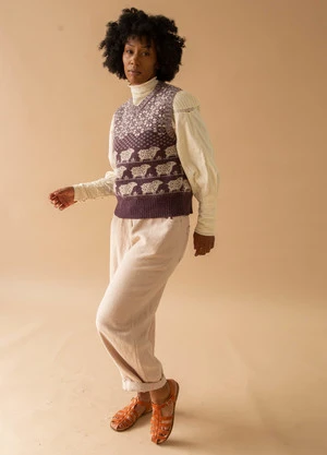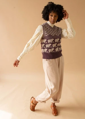 A luxuriously crafted sleeveless jacquard sweater featuring a timeless straight cut, classic V-neck silhouette, and intricate patterned front and back, complemented by ribbed edge finishes.