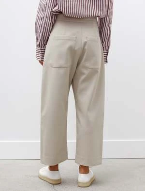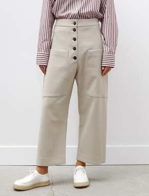 A uniquely shaped trouser, these have an extra high rise and cropped length. They have conveniently roomy front and back pockets and a slight equestrian aura with the extended high rise, and rubberized button closure.