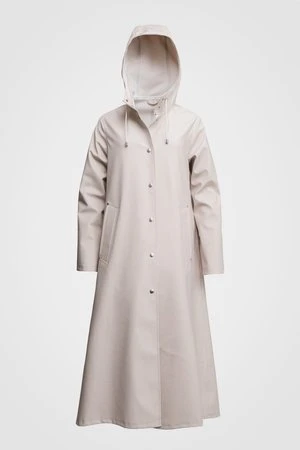 Stutterheim Mosebacke long raincoat in light sand is the a flowing A-line womens raincoat combining flair with all-weather protection in a slightly long cut. Mosebacke is the ladies specific complement to our unisex Stockholm raincoat. It combines the best of Stutterheims Scandinavian design sensibilities and wet-weather protection with a flowing, feminine silhouette. It is handmade in rubberized cotton, comes unlined and with welded seams. The finest craftsmanship is used to create this beautiful raincoat, here in light sand with silver buttons, white cotton lining and hemp strings. See other colors in the Mosebacke here! Check out the straight Stockholm style here. Mosebacke