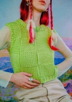 This vest is the perfect transitional piece. Checkered pattern in a poppy lime green.