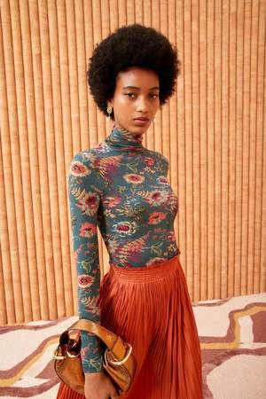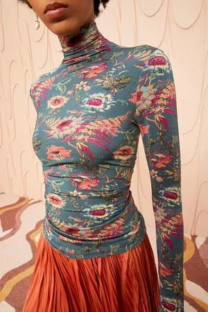 As featured in Look 7 of the Pre-Spring ’24 Lookbook, the Aurelia Turtleneck is a favorite silhouette from past seasons made from lightweight tricot jersey and features our gorgeous Larkspur floral motif. This long sleeve top has a close fit that makes it perfect for layering or wearing on its own.