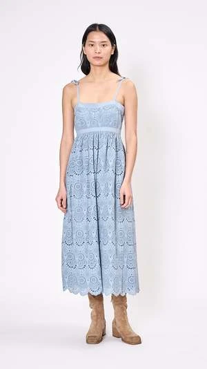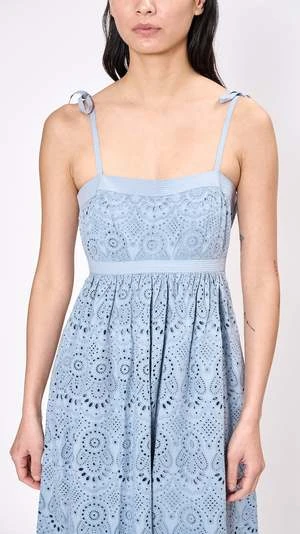 The Matilde Dress has a fitted straight neckline bodice with an empire waist silhouette. It features adjustable tie straps, intricate eyelet detail throughout, side-seam pockets, and a side-seam zipper.