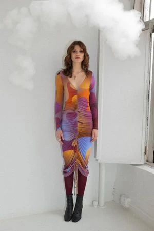The Babylon dress features UIM custom artwork Artemisa. This striking figure-hugging midi length dress is made from lightweight, stretch, silky-jersey, with adjustable ruched detail that pulls from hem.